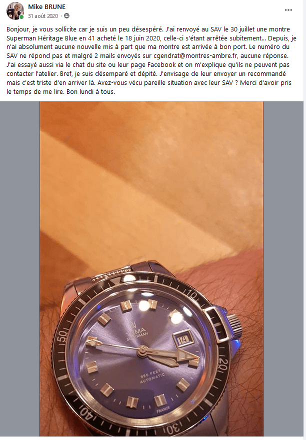 Sans nouvelle de Yema au bout de quasiment un mois et n’arrivant pas à les joindre au téléphone, je farfouillais dans les groupes Facebook pour finalement tomber sur le Club Yema et Yema Watches Owners. Le Club étant francophone, je postais le message suivant :