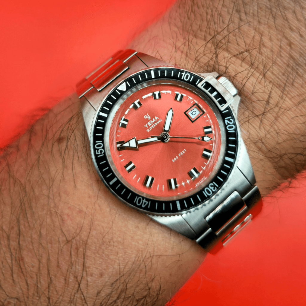 Toujours chez Yema mais en plus accessible, la Superman quartz Tangerine sortie cet été : cadran fun rouge oranger, verre bombé acrylique (permettant des photos de dingue), boîtier et bracelet brossé. Le tout pour 400 balles !!! Il paraît que Yema va arrêter les Superman quartz : ÉNORME CONNERIE…