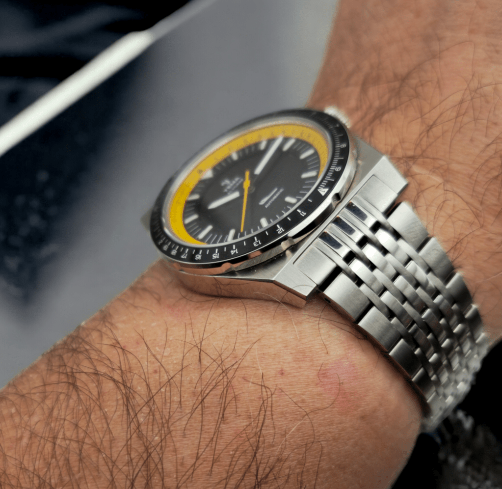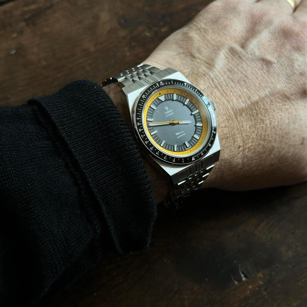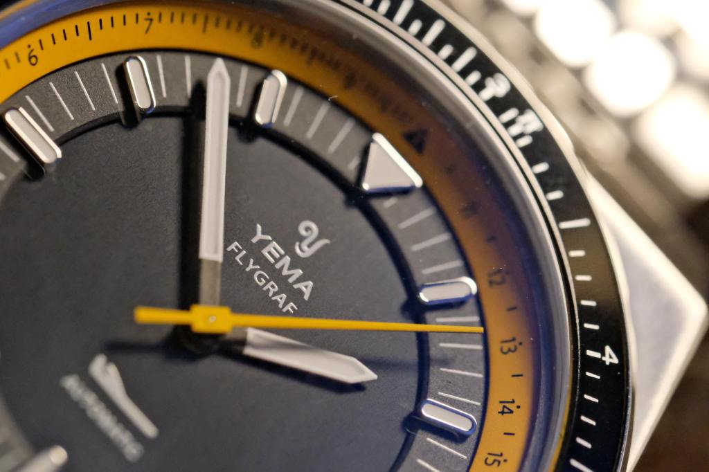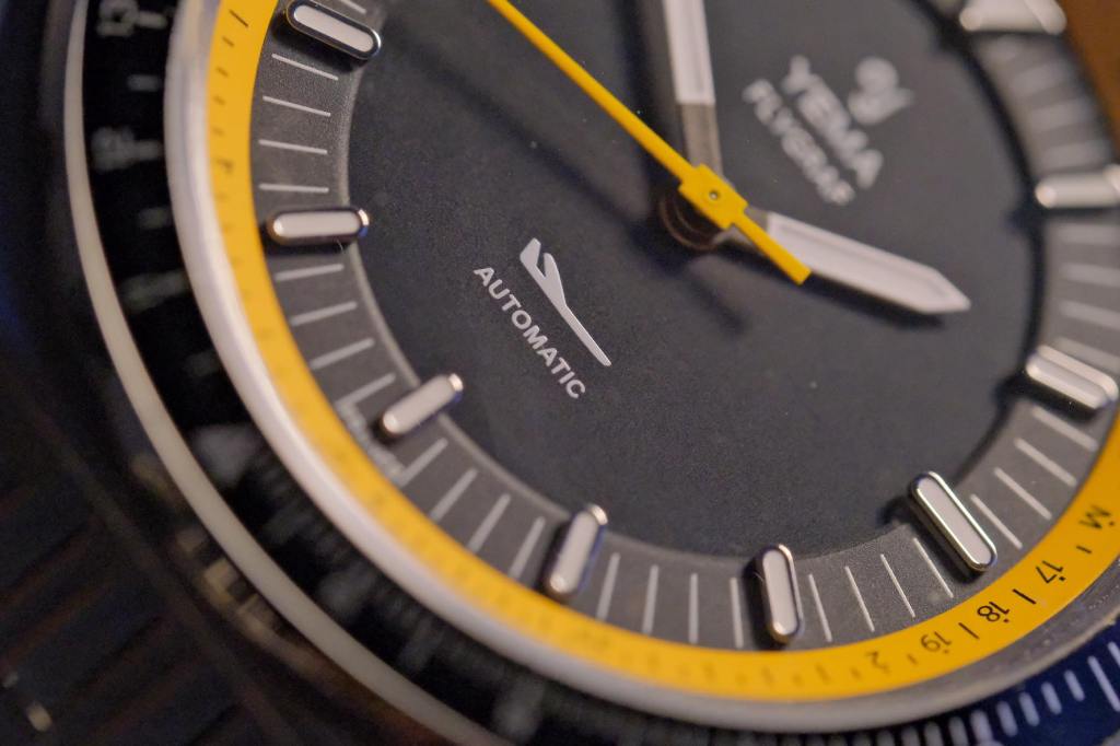 Le cadran brossé, sobre et noir , fait presque habillé avec son logo Yema et le dessin iconique du petit avion de profil que toute Flygraf digne de ce nom se doit d’avoir. Il est sublimé par le réhaut jaune orangé qui modernise énormément l’ensemble et qui, conjugué à la sobre lunette avec insert en aluminium noir, vous permettra, entre autre, de savoir si votre Falcon 900 va tomber en rade de kérosène et s’écraser…