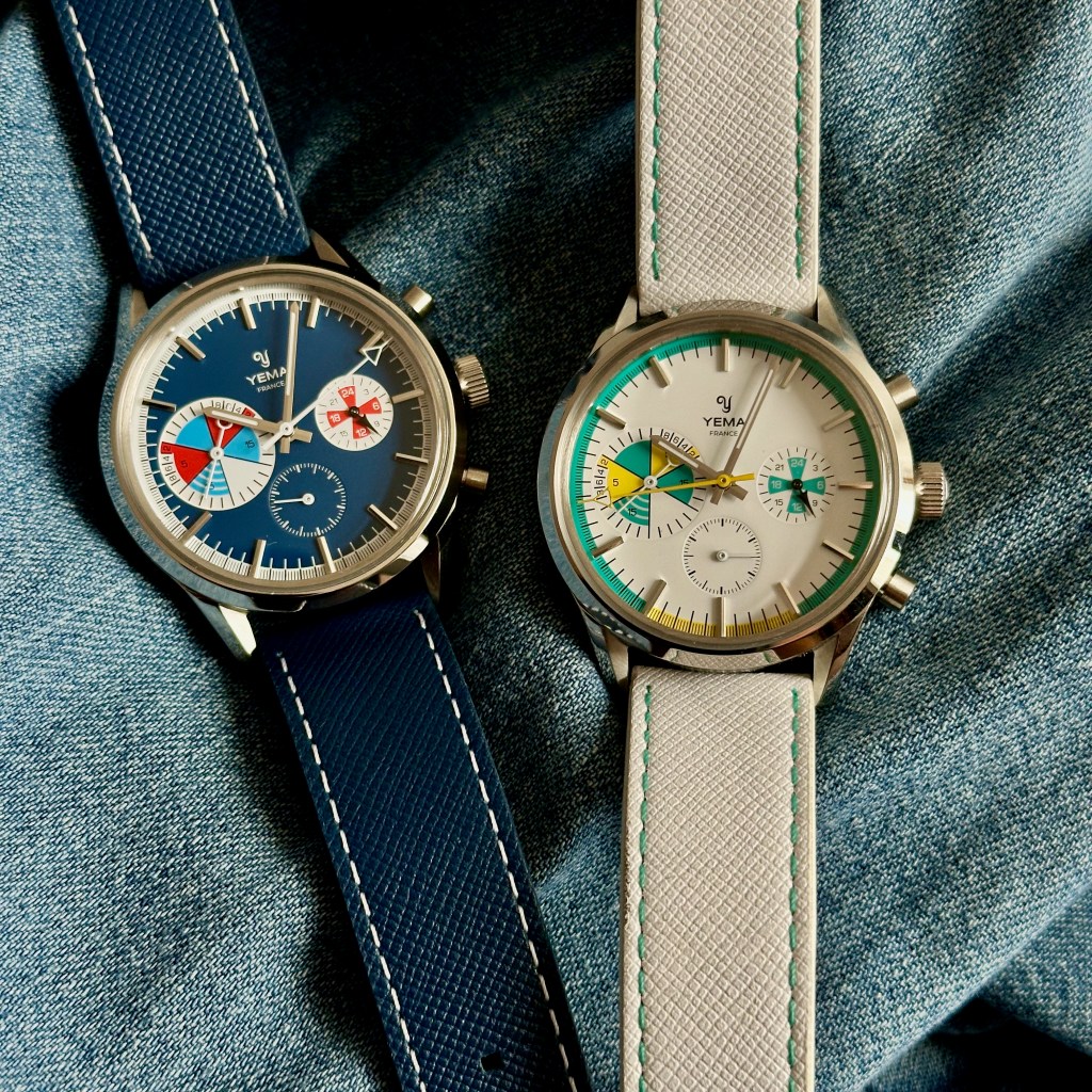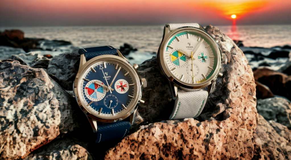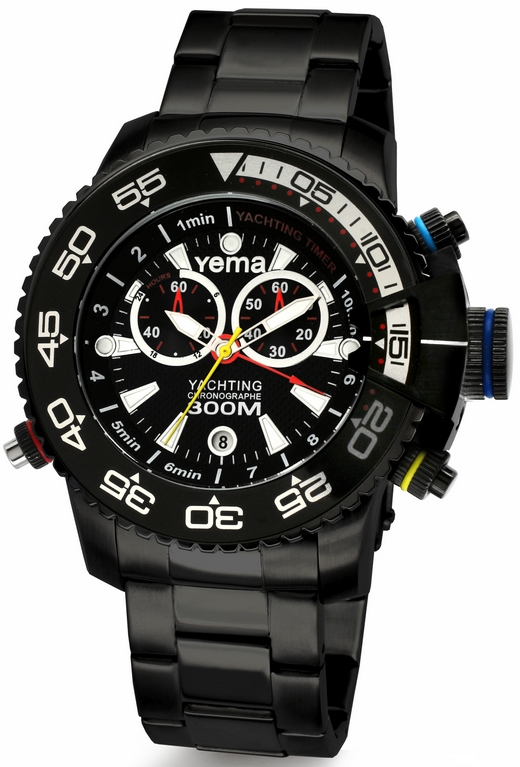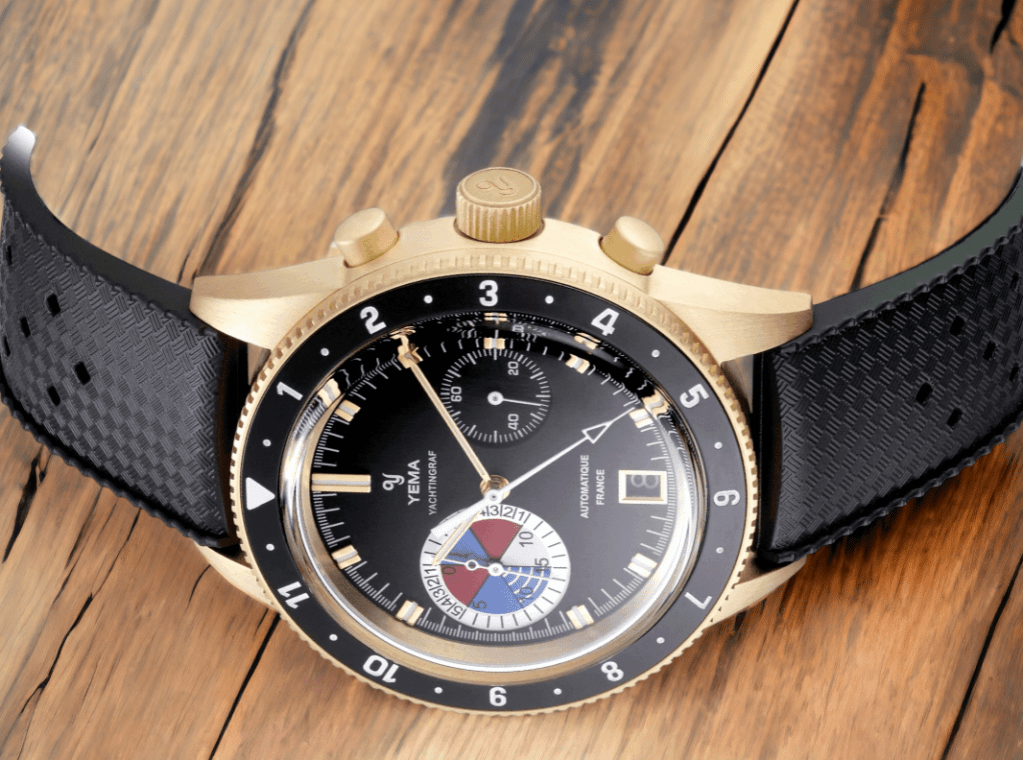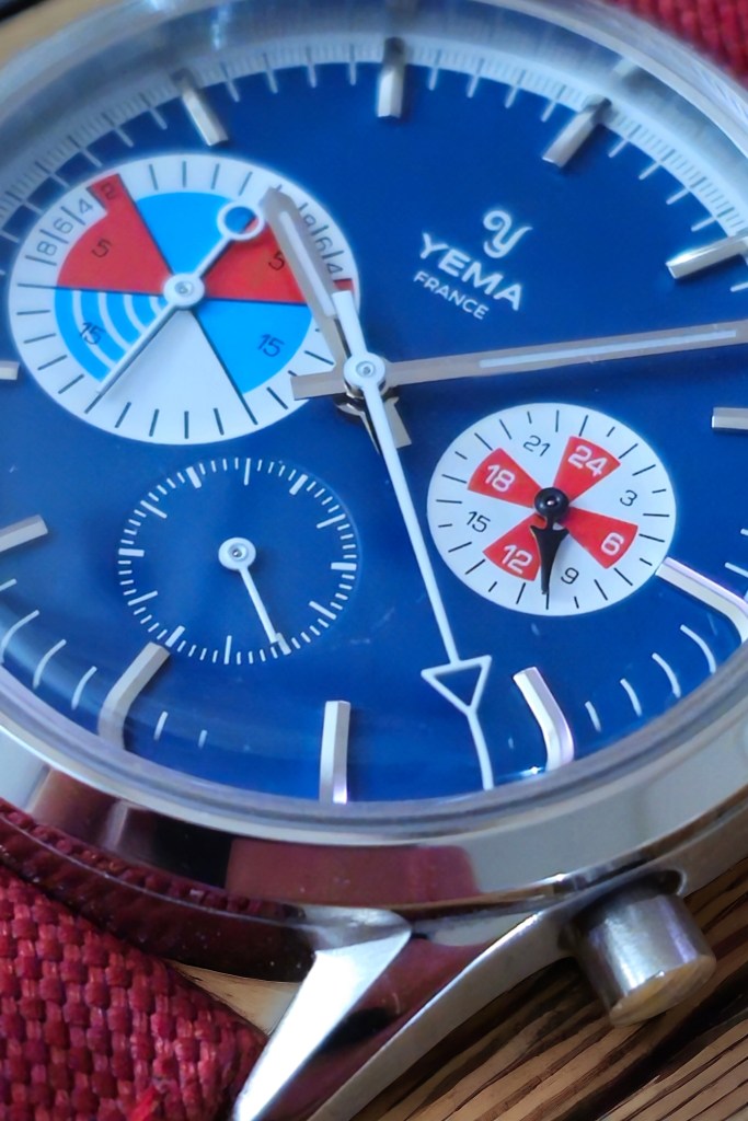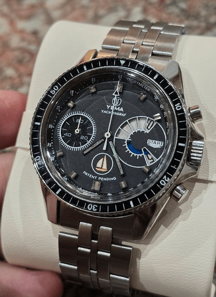 Mais c’est surtout Yema, qui en 1966, sort sa première montre de régate : la Yema Yachtingraf (ici avec mouvement Valjoux 7730).