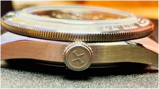Terminons par la couronne, de type « Big Crown », vissée, et gravée du logo Medeor. Simple mais efficace. On sent que les tolérances d’ajustement sont excellentes car son maniement est très fluide (même si vous ne devriez pas avoir à y toucher trop souvent vu la réserve de marche du mouvement !)