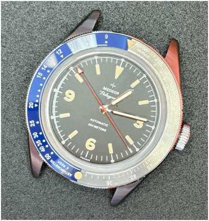 Reste à aborder les inscriptions, à 12h le logo puis Medeor Pulsoograph, à 6h Automatique 200 mètres. Le logo est plutôt sympa, mais c’est surtout la police d’écriture choisie pour le modèle (pulsograph) qui anime et donne du charme à l’ensemble.