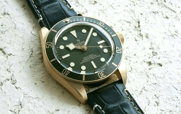- Tudor propose une version en or jaune de sa Black Bay Fifty-Eight, avec un cadran et des détails dorés qui évoquent le style « gilt ». Cette montre combine l’esprit des montres de plongée classiques avec une touche de luxe.
