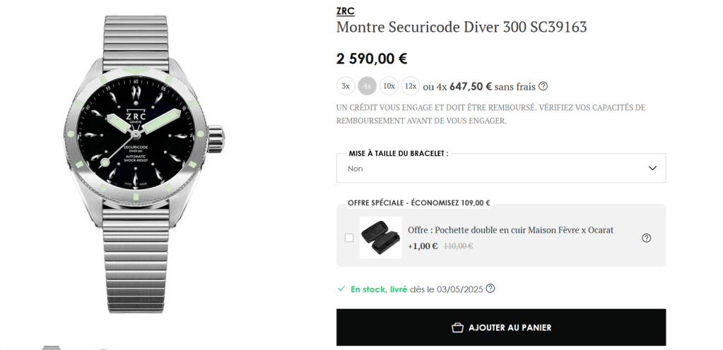 Effectivement, je vous rappelle que le Sellita SW200 se trouve dans des montres telles que les ZRC vendues beaucoup plus cher comme cette Securicode Diver 300, présentée ici chez Ocarat à 2590 € :
