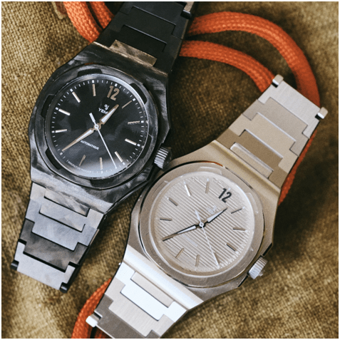 Vendue 379 € TTC avec deux bracelets à pompes rapides : acier et cuir, elle dispose d’un mouvement quartz Suisse Ronda 1062, d’une verre saphir et d’une couronne siglée.