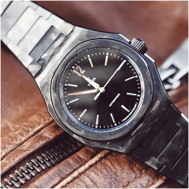 Le boitier est très travaillé, géométrie asymétrique assez complexe. La finition brushed couplée au traitement PVD mettent bien en valeur le boitier. La lunette monobloc reçoit la même finition que le boitier. C’est réussi, c’est qualitatif et surtout, ça marche parfaitement.