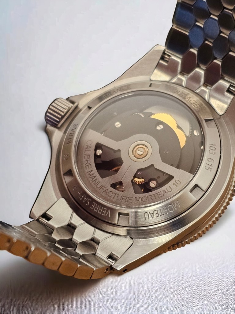 Pour le reste, on est comme je vous l’indiquais sur les bases de la Steel : bracelet scale avec vis pour ôter les maillons, fond de boite transparent saphir et bien évidemment le calibre manufacture CMM10 (70 heures de réserve de marche et promise de précision entre -3 / +5 secondes). Nos deux exemplaires tournant à quasiment zéro de dérive.