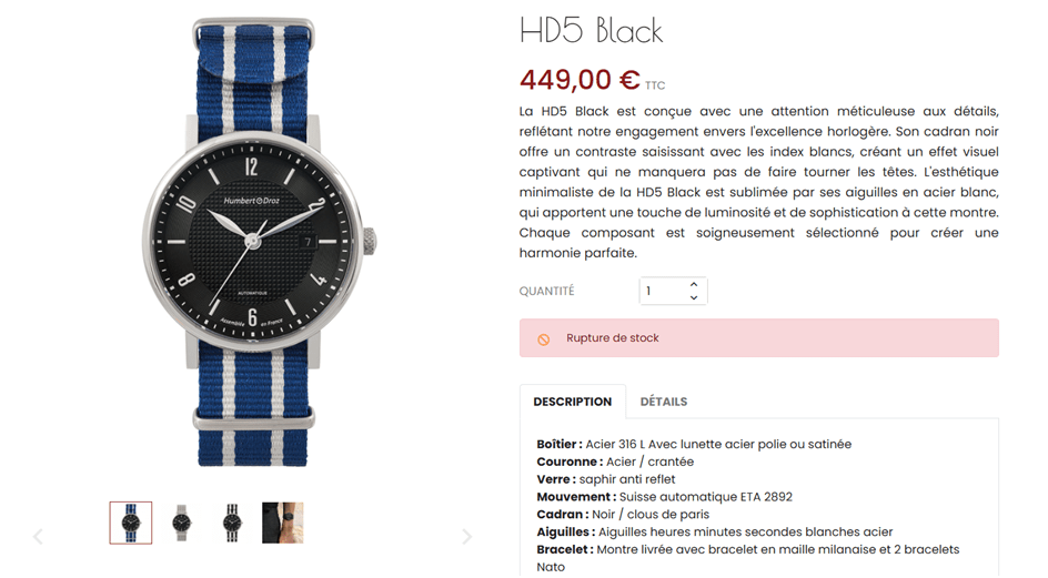 HD5: Sortie de collection elle aussi. On arrive avec un peu plus de sophistication. Montre habillée de 39mm de diamètre et 22mm d’entrecorne et qui embarquait un ETA 2824-2 top grade pour 449 euros !