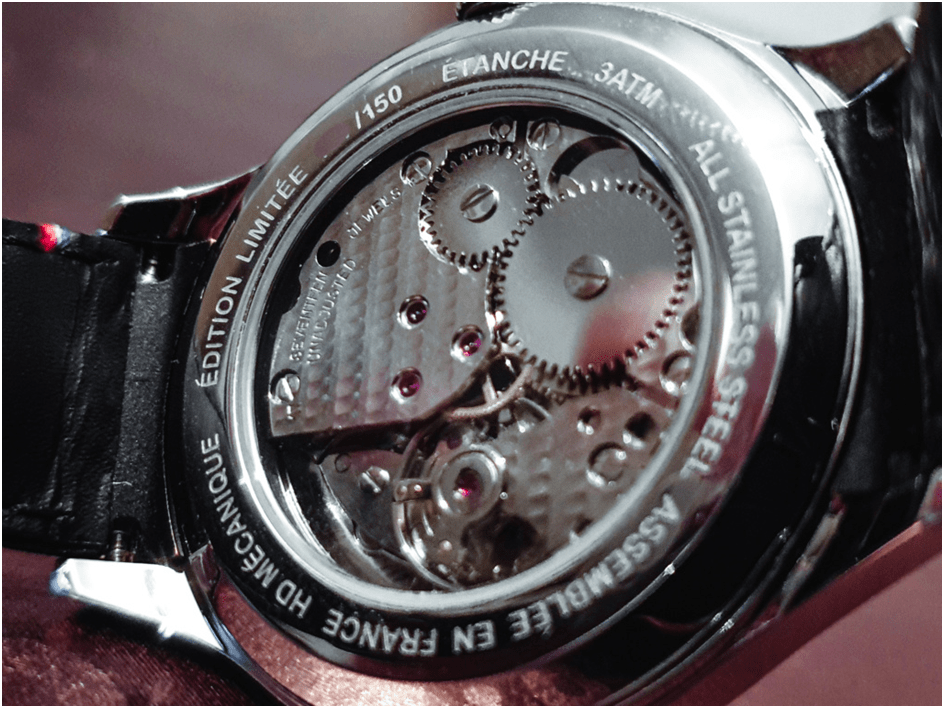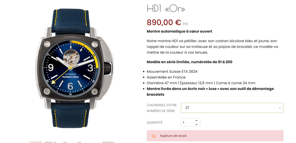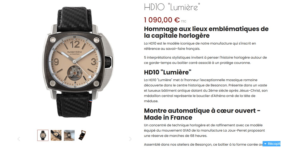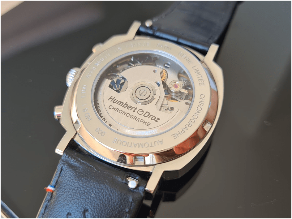 HD10: C’est une HD1 avec un zéro en plus, coussin viril avec protège couronne amovible. Elle est à 1090 euros avec le mouvement G1A0 LAJOUX PERRET assemblé par Humbert Droz. Il s’agit du G100 à cœur ouvert. C’est la montre de l’ambassadeur de la marque: François Xavier Demaison. Les déclinaisons ont le nom de monuments de la région de BESANÇON.