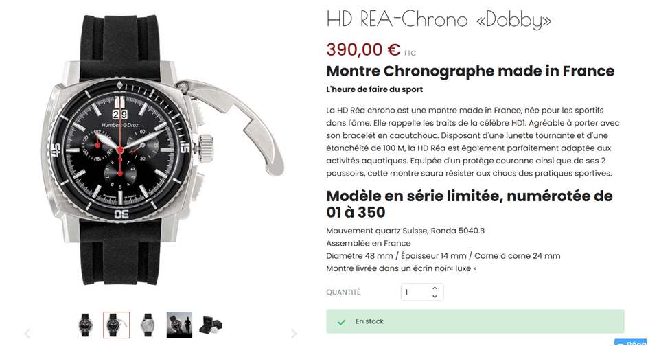 HD Réa: Chronographe Quartz avec un boîtier rappelant celui de la HD1 qui conserve le protège-couronne amovible. Elle coûte 390 euros. Les déclinaisons sont nommées d’après Harry Potter.
