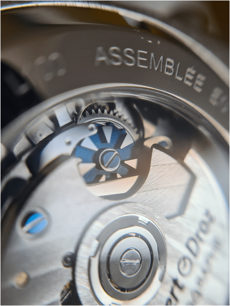 Ce mouvement, d’ailleurs, est le L100 avec 61 heures de réserve de marche. Vous savez sûrement que HUMBERT DROZ a un partenariat avec LAJOUX-PERRET pour l’assemblage des mouvements qui deviennent alors un peu plus français. HUMBERT DROZ montre son expertise en assemblant ce chronographe complètement décoré, jusqu’à la roue à colonne bleuie.