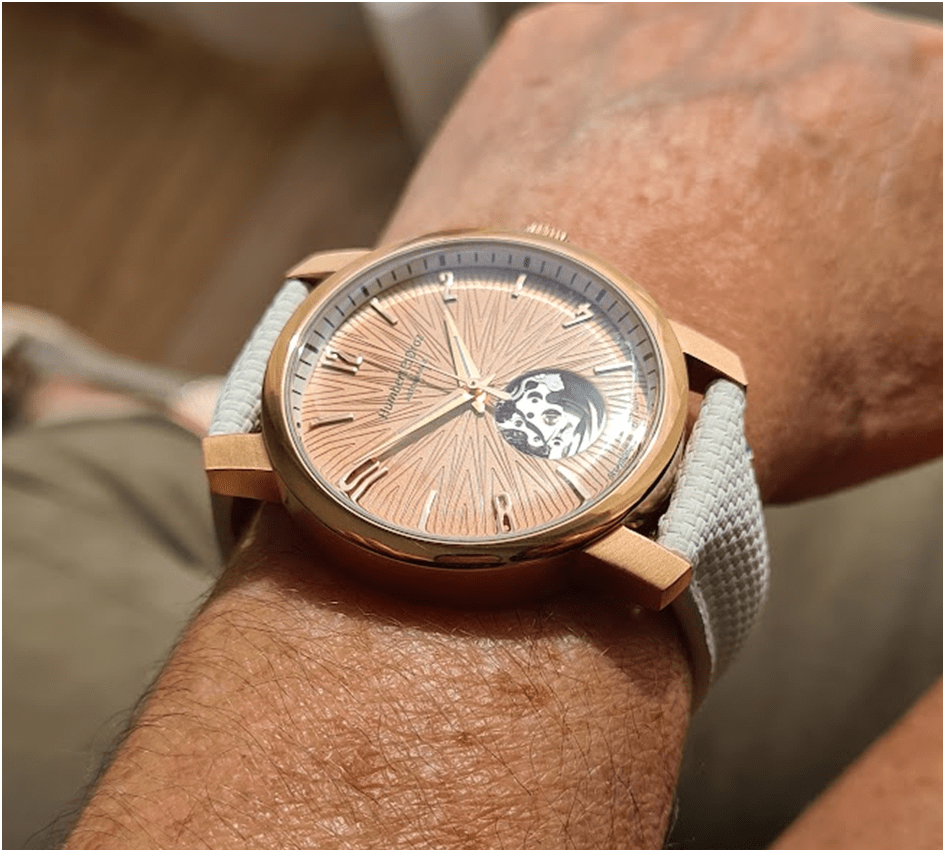 Sinon la montre en elle même est vraiment belle et tout aussi bien finie que les autres HUMBERT DROZ. Le cadran est couleur or rose mais rappelle le motif et le coloris de la première HD8 qui m’avait fait rêver.