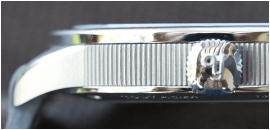 Yema soigne les détails sur cette montre. La couronne par exemple en en forme de coussin signée du « Y » historique de Yema. Habituellement ronde, la couronne est ici à l’image du boitier ni carré, ni ronde. La couronne n’est pas vissée, ce qui est cohérent pour une montre habillée. Les plus maniaques pourront donc avoir la couronne bien alignée avec le Y vertical.
