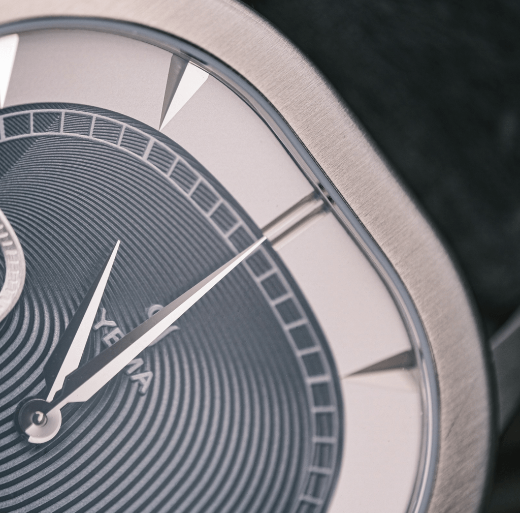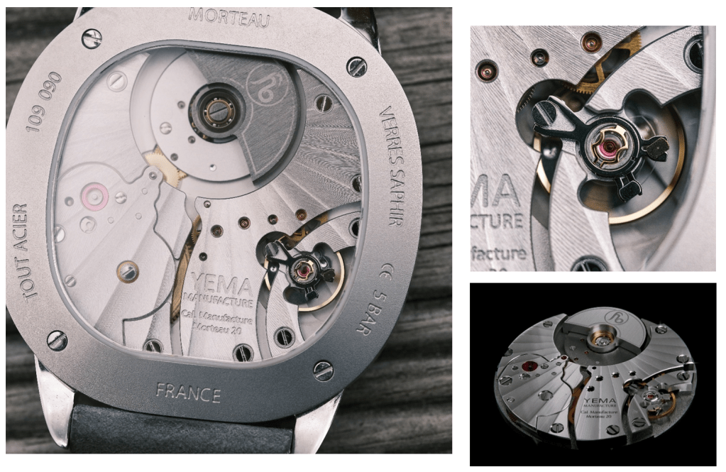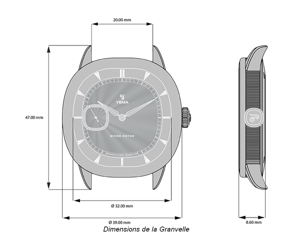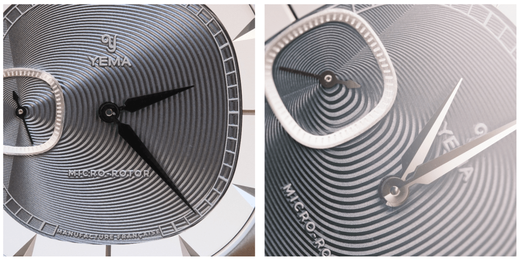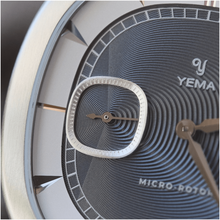 Le design est inspiré des arches du Palais Granvelle à Besançon. Cette forme atypique pour des arches se retrouve dans la forme du boitier, ni carré, ni rond mais également dans la forme du sous compteur petite seconde. Le palais Granvelle permet à Yema de se reconnecter avec ses origines et d’ouvrir une nouvelle voie en termes de design par rapport à leurs habitudes. Une prise de risque intéressante proposant de nombreux détails que nous allons développer. A cette inspiration s’ajoute une volonté manifeste de jouer au maximum sur l’asymétrie dans le design de nombreux éléments.