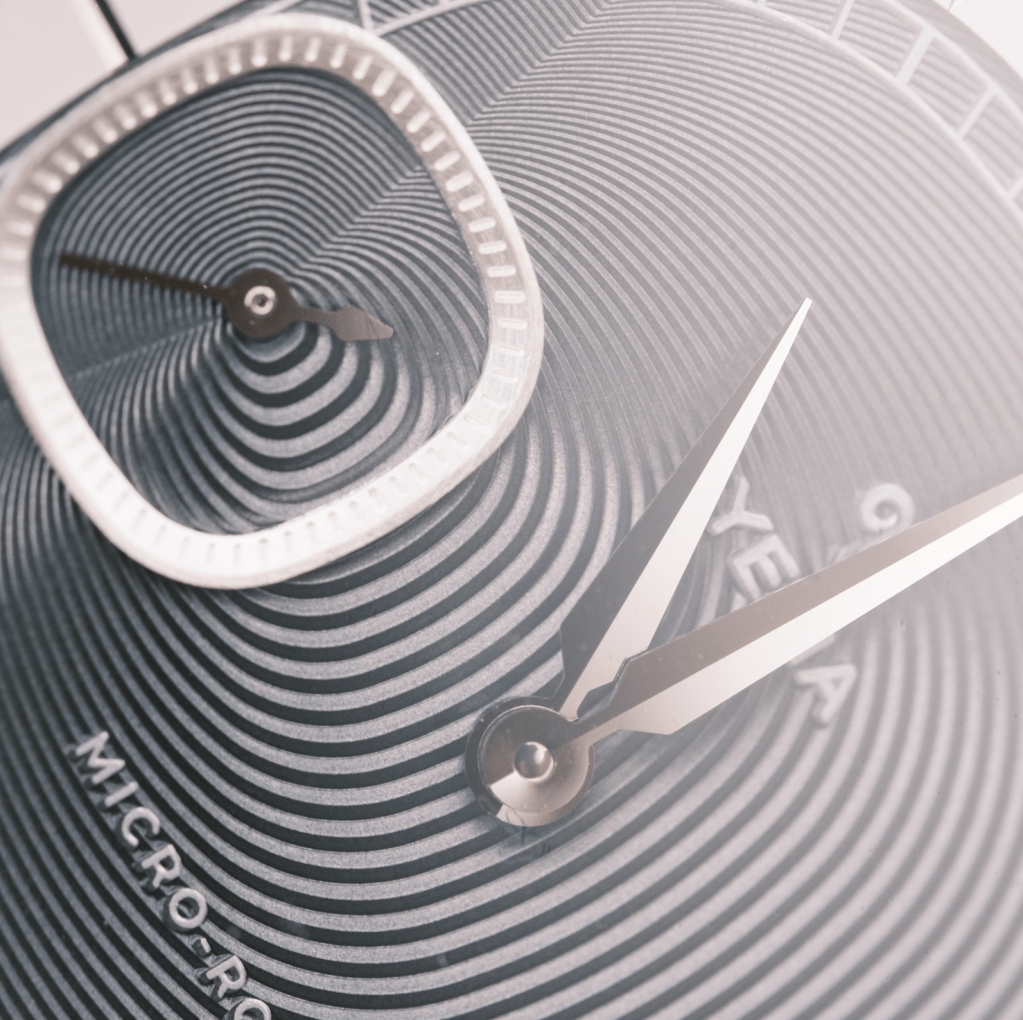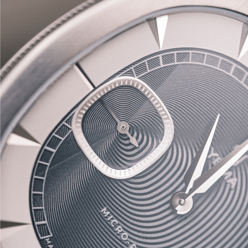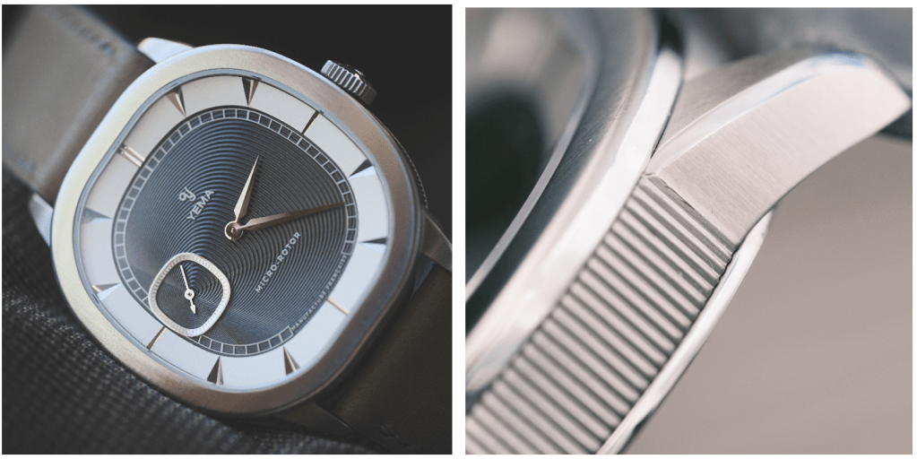 Le design est inspiré des arches du Palais Granvelle à Besançon. Cette forme atypique pour des arches se retrouve dans la forme du boitier, ni carré, ni rond mais également dans la forme du sous compteur petite seconde. Le palais Granvelle permet à Yema de se reconnecter avec ses origines et d’ouvrir une nouvelle voie en termes de design par rapport à leurs habitudes. Une prise de risque intéressante proposant de nombreux détails que nous allons développer. A cette inspiration s’ajoute une volonté manifeste de jouer au maximum sur l’asymétrie dans le design de nombreux éléments.