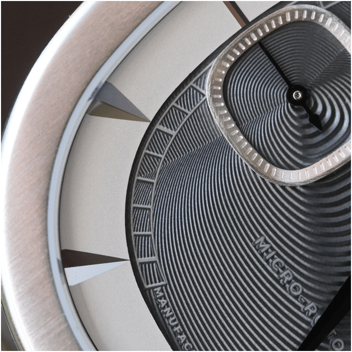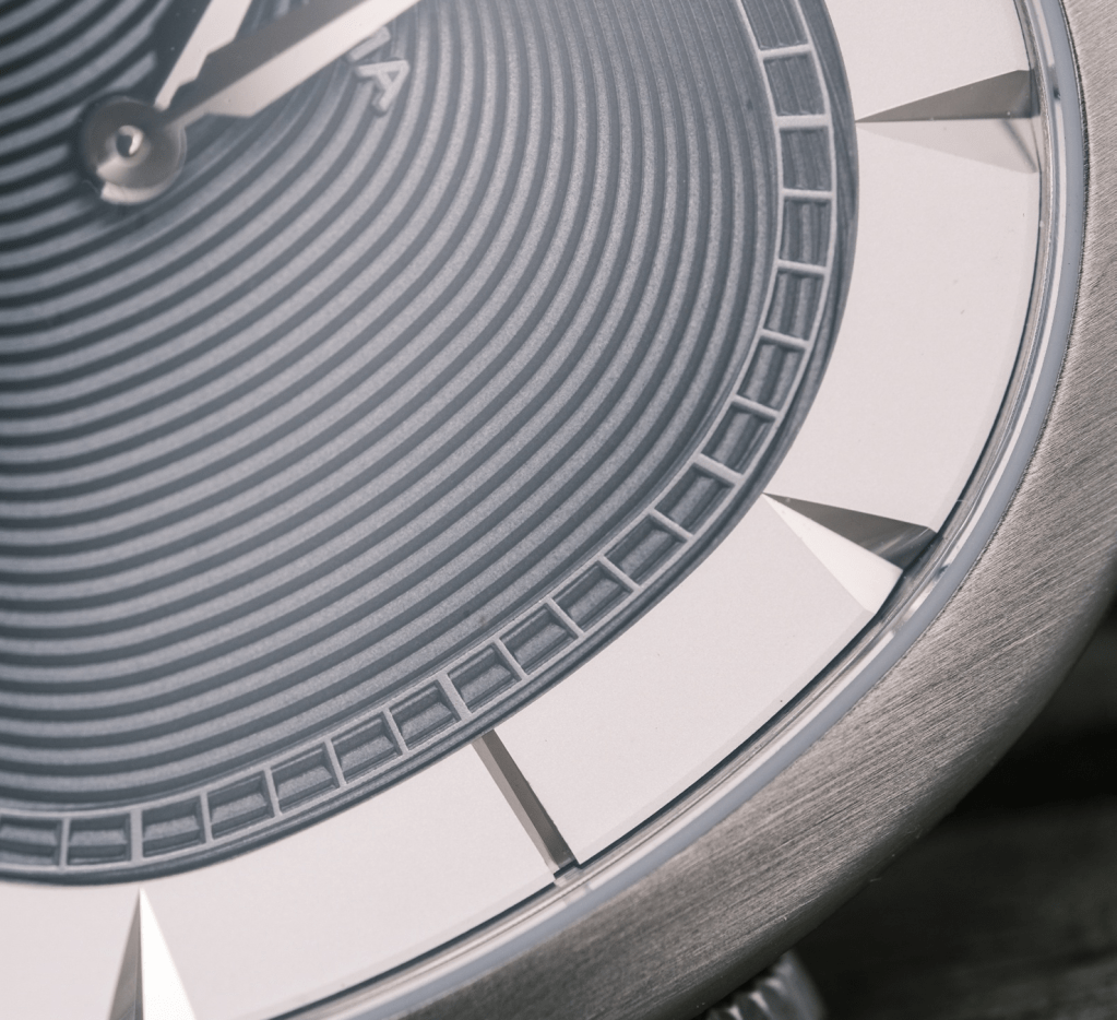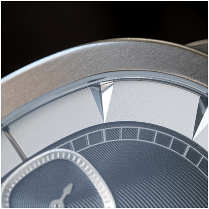 Le rehaut des index encadre le cadran tout en le mettant en valeur. Les index sont gravés à même le métal. Ils inversent le relief pour jouer avec l’ombre et la lumière ce qui fonctionne parfaitement. En les regardant, on n’est souvent convaincu qu’ils sont en surépaisseur alors qu’ils sont bien gravés. Interaction avec la lumière, quel que soit l’angle comme pour le cadran.