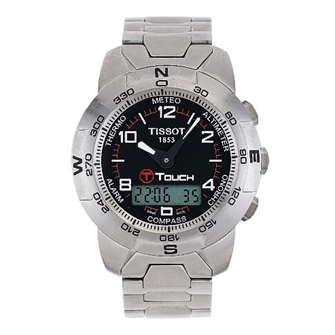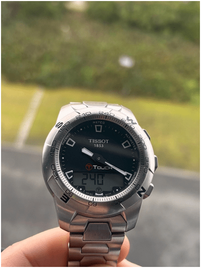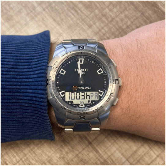 Alors de quoi parle-t-on ici ? D’une Tissot T-Touch première génération, cadran noir, bracelet acier. Exactement le modèle ci-dessous.